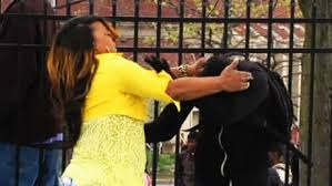 On the now famous cell phone video, she grabs him (by the neck) and slapped him around, demanding he “take his a– home”–exactly what my mother would have done (and all mothers SHOULD for that matter).