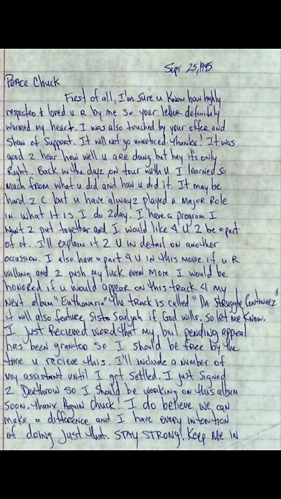 Handwritten Letter Written By 2pac To Chuck D Of Public Enemy 1995– A portion of a letter Tupac sent to Public Enemy’s Chuck D –that he never got. Photo: Only Hip Hop Facts Spread the word: Click to share on X (Opens in new window) X Click to share on Facebook (Opens in new window) Facebook Click to email a link to a friend (Opens in new window) Email Like Loading... Related Author: brandycavalli Today's post was by Brandy "Bee" Cavalli. Brandy is an international marketer, freelance writer based in Atlanta, GA. View all posts by brandycavalli