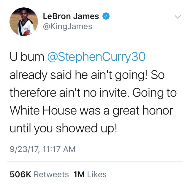 NBA Superstar LeBron James wasn’t going for the sports slander and quickly retorted on behalf of Steph Curry calling Trump a “bum” and making it clear that “ain’t no invite bih” because Curry had already declared that he was not going.