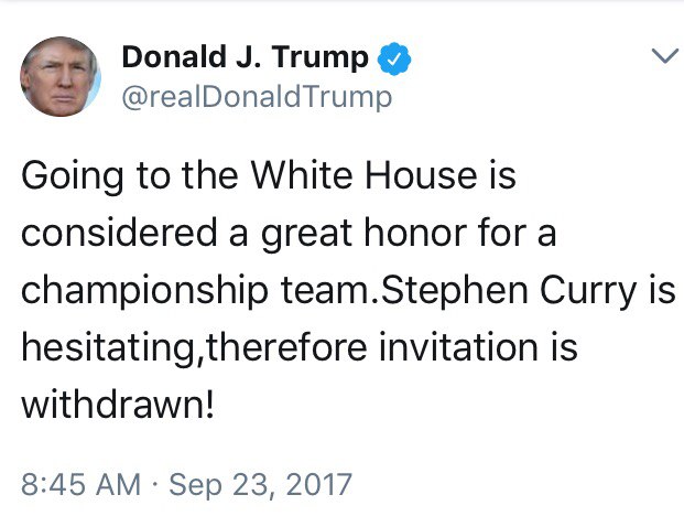 Unfazed and fueled by the backlash, Trump then aimed his Twitter guns at the NBA by rescinding an invitation from the Golden State Warriors and calling out superstar Steph Curry after he made it clear that he probably would not be interested in attending.