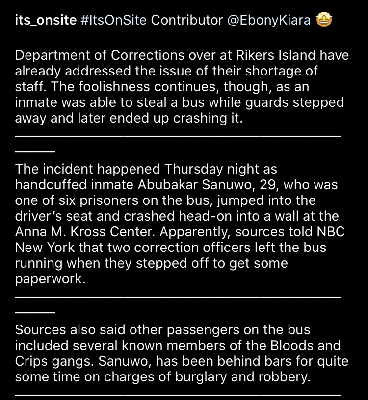 Rikers Inmate Steals Prison Bus Full of Inmates; Crashes into Wall Spread the word: Click to share on X (Opens in new window) X Click to share on Facebook (Opens in new window) Facebook Click to email a link to a friend (Opens in new window) Email Like Loading... Related Author: brandycavalli Today's post was by Brandy "Bee" Cavalli. Brandy is an international marketer, freelance writer based in Atlanta, GA. View all posts by brandycavalli