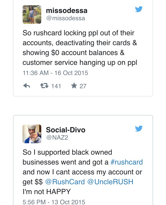 Via Fortune– Users of RushCard, the prepaid debit card founded by hip-hop mogul and DefJam co-founder Russell Simmons, have been complaining all across Twitter that they’ve been locked out of their accounts, that their accounts are suddenly showing $0 balances, and that they aren’t getting any answers from customer service.