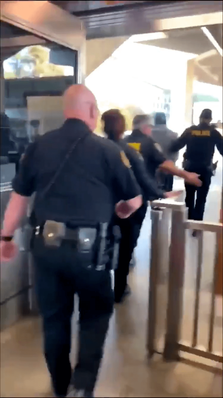 The man (and the woman) videoing the incident questioned the officer and pointed out that there was no signage stating food was off limits. Last time I checked, millions of people drink coffee and eat snacks/food at the train station. In most train stations they have vending machines with sodas and snacks.
